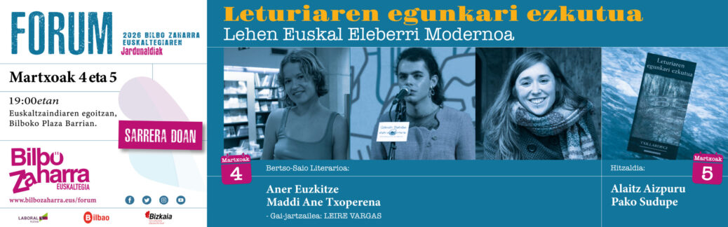 02Noiz: Martxoaren 4a, asteazkena, 19:00 Non: Euskaltzaindiako areto nagusian, Bilboko Plaza Barrian Bertso-saio literarioa Txilardegiren “Leturiaren egunkari ezkutua” liburuan oinarrituta, gaurkoan bertso-saioan izango ditugu Aner Euzkitze eta Maddi Ane Txoporena rtsolarien eskutik. Gai-jartzailea, Leire Vargas bertsolaria eta idazlea izango da.   Leire Vargas (Gai-jartzailea) Durangon jaioa, 2002an. Bizkaitar bertsolari,...